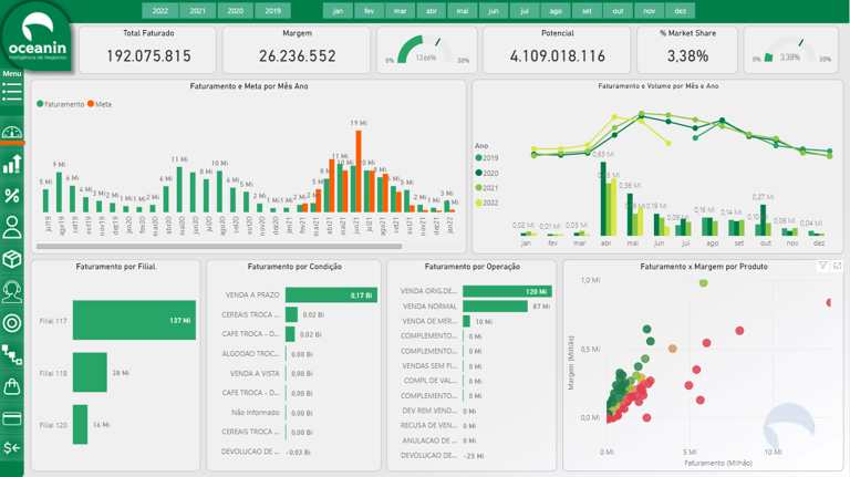 Analise a variação ao longo do tempo, por filial, consultor, cliente, produto e outras medidas e, juntamente com crédito e contas a receber, monte as análises e tome a decisão certa.