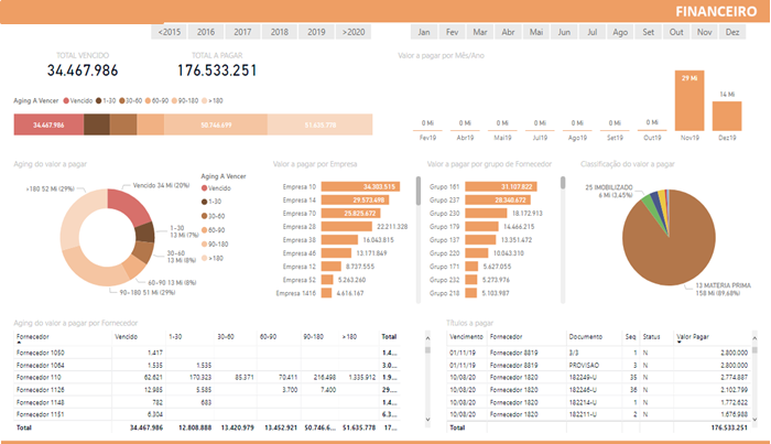 Visualize as contas a receber e pagar por empresas, filiais, fornecedores, clientes e seus ratings, tipo de títulos, status e muito mais com gráficos, tabelas inovadoras, tudo em um clique.